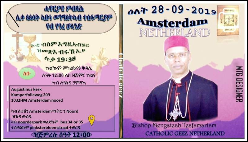 ኣብ ሃገርና ዘሎ ኩነታት ቤተክርስትያንና ኩሉ ይሰምዖን ይርእዮን ስለዘሎ ምድጋሙ ኣየድልን። በዚ ኩነታት እዚ ርእሰ ጳጳስ ካቶሊካዊት ቤተክርስትያን ኤርትራ ብጹዕ ኣቡነ መንግስትኣብ ተስፋማርያም ኣብ ኤውሮጳ ኣብ ዘካይዱዎ ዘለዉ ዑደት ንዕለት 28 መስከረም ኣብዚ ኣብ ሆላንድ ምሳና ምስ ህዝቦም ክራኸቡን ክባርኹን መደብ ሒዞም ስለዘለዉ፡